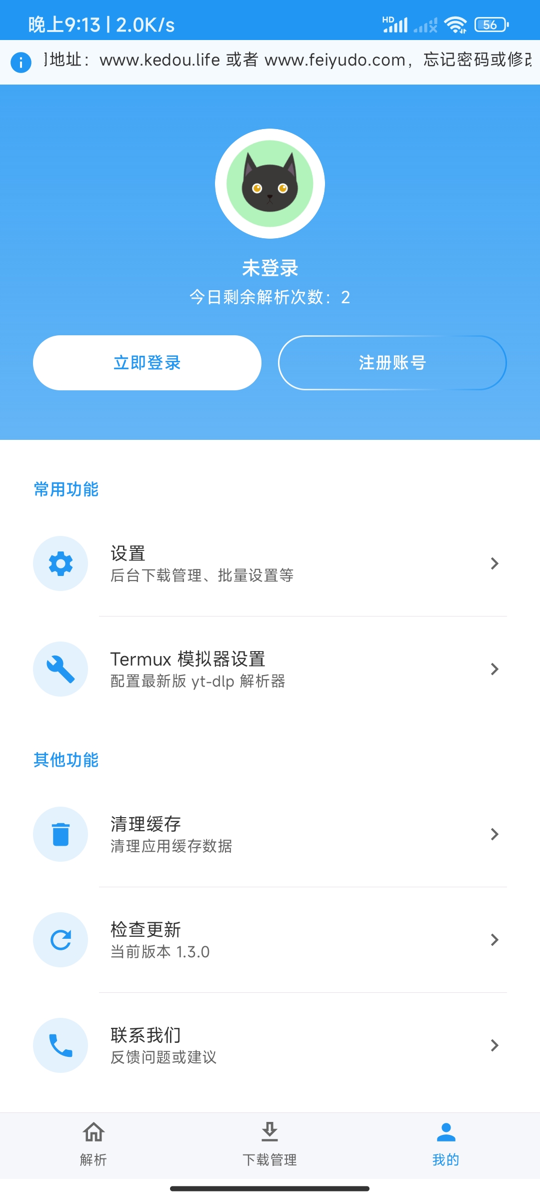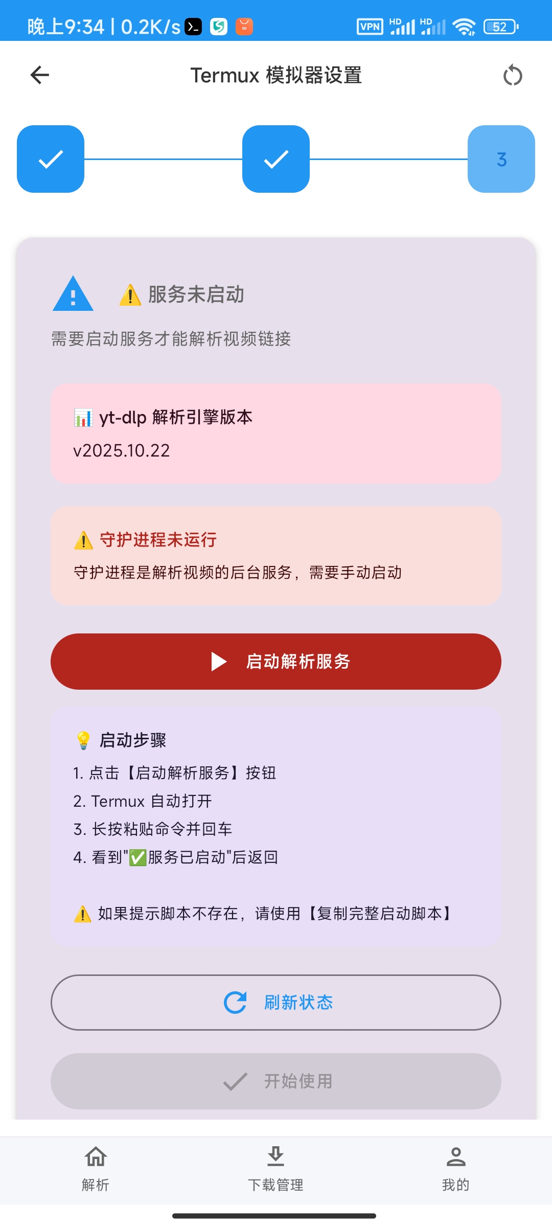 最后,如果解析长时间等待,超过一分钟,可以打开Termux,查看是否有弹窗请求权限时,“允许”即可,然后回到首页重新解析。完成第一次解析后,后续基本直接使用解析即可。如果手机重启了,请从上述第9步开始。有些YouTube链接可能需要登录才能够解析,前往“Cookie管理”登录你的YouTube账号,然后重新解析即可。