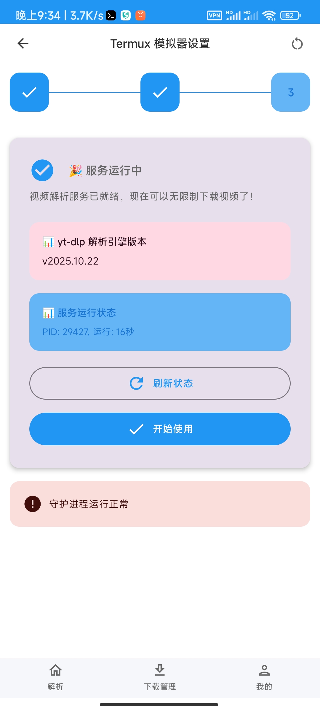 注:有些手机中途可能跳转到手机设置里面的省电模式,选择无限制,或者允许耗电即可,解析的时候需要保持Termux一直可用。