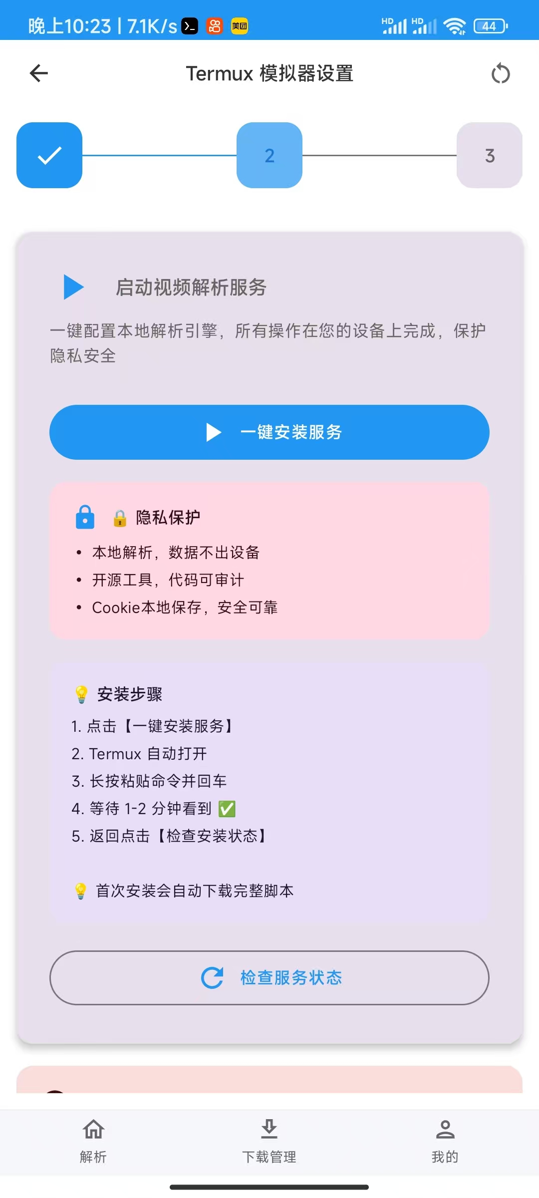4、这时将会进入步骤2,点击“一键安装服务”,将会直接打开Termux模拟器