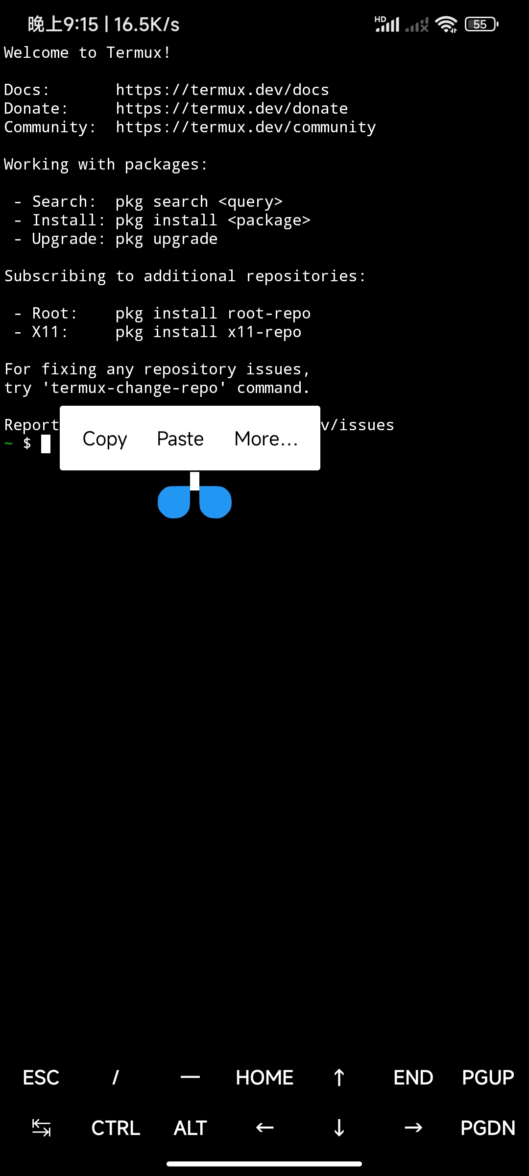 5、进入到Termux后,长按屏幕,点击“Paste”,粘贴需要运行的命令